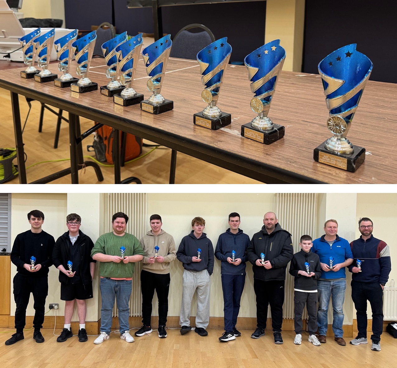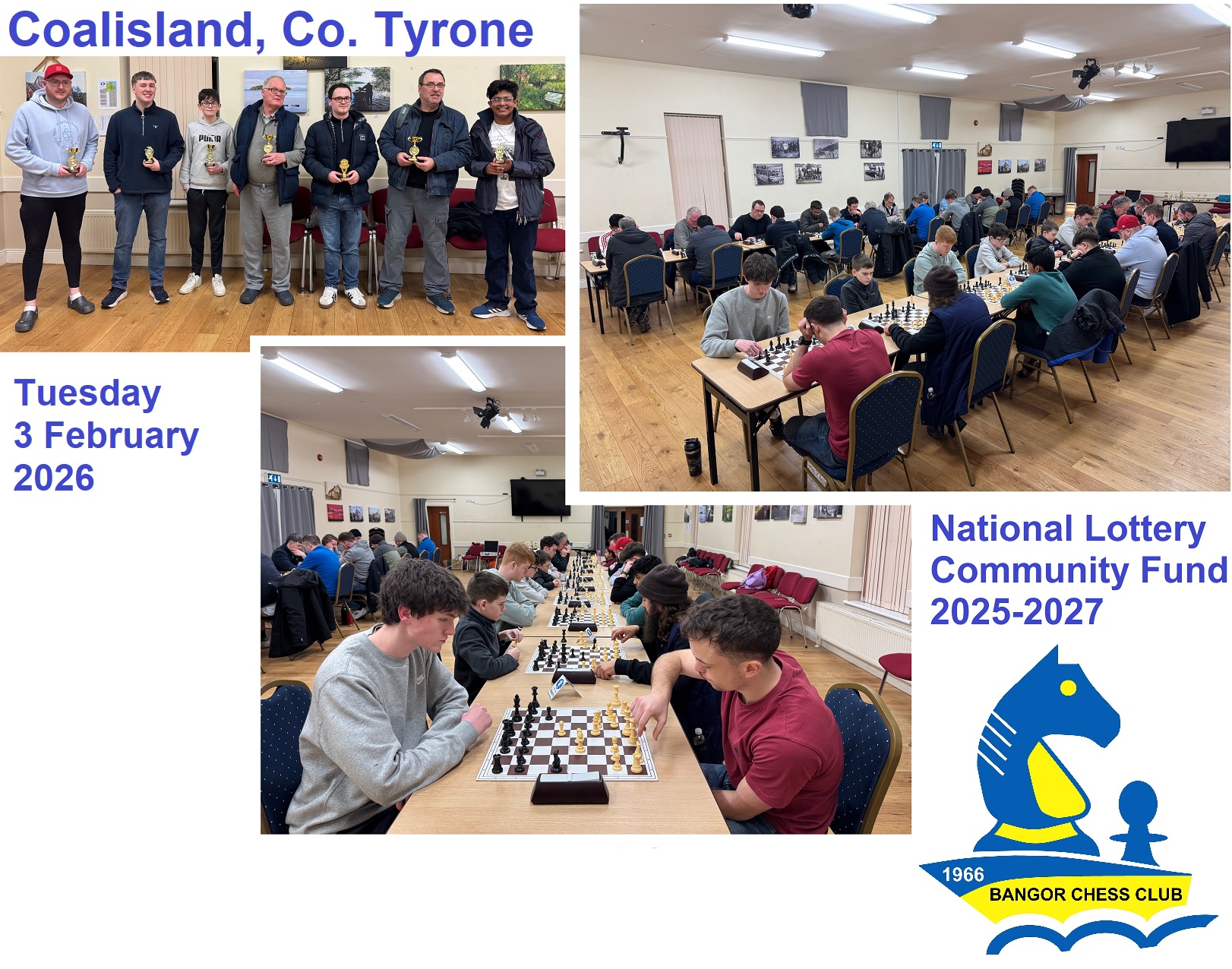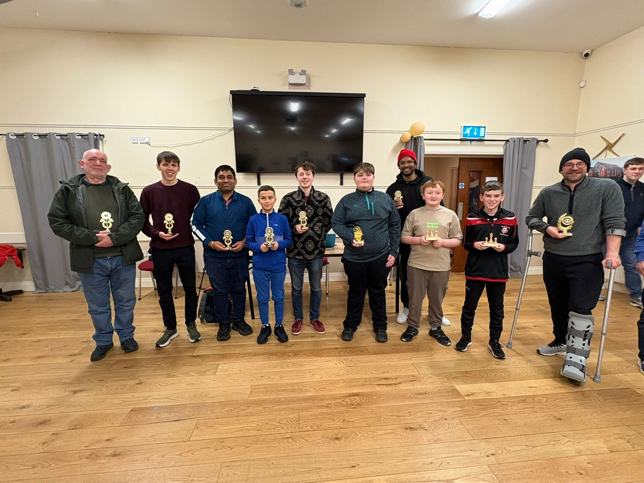 The first of these events was launched in East Belfast at Maynard Sinclair Sports Pavilion on the evening of Saturday 24 January 2026. It featured 28 chess players who enjoyed playing a 10 round blitz. Ages ranged from teenagers to pensioners and we enjoyed a mixture of nationalities, with local players competing with players from Lithuania, Kazakhstan and India. 10 trophies were awarded for 1st, 2nd, 3rd, Intermediate 1st, 2nd, 3rd, Junior 1st, 2nd, 3rd and Best Newcomer. Participants attended from Coalisland, Lisburn, Ballyclare, Bangor, Newtownards, Belfast and Dublin.
