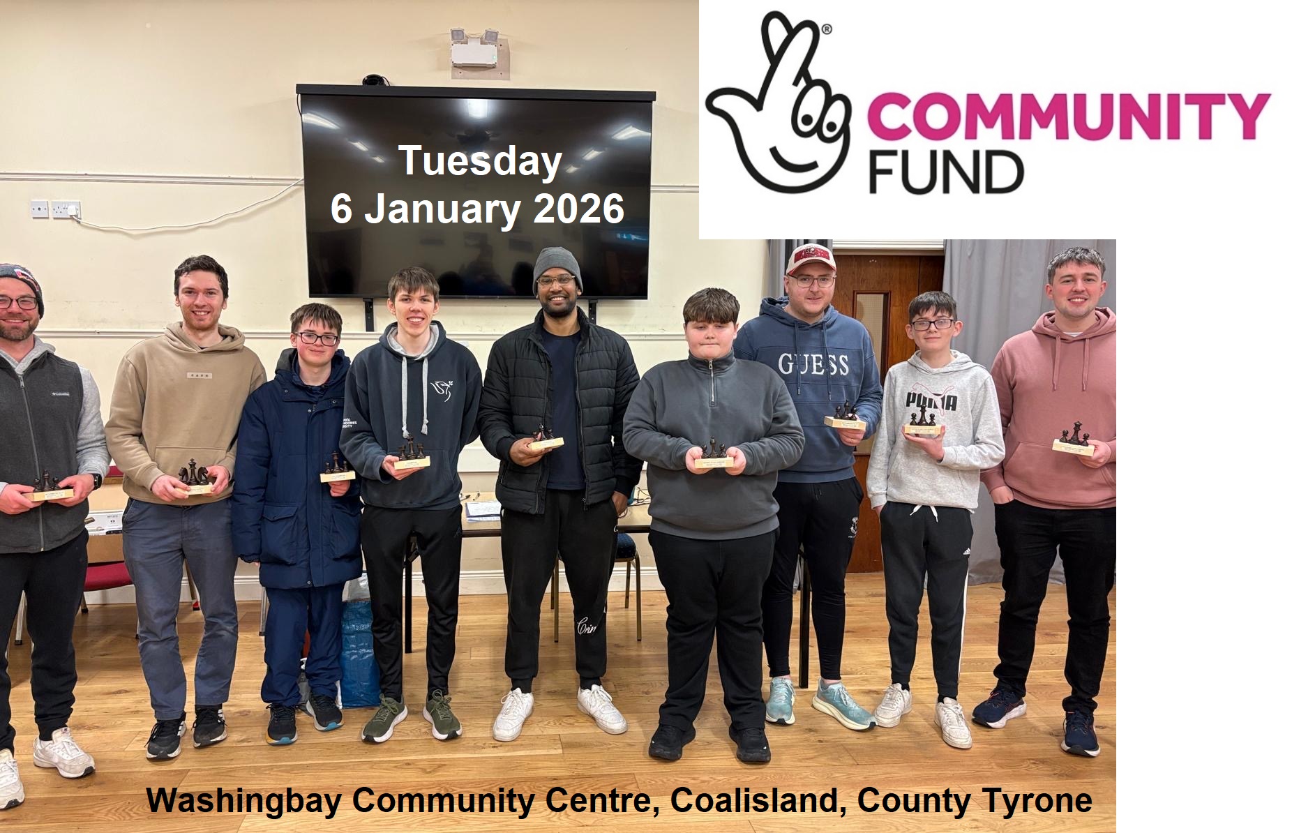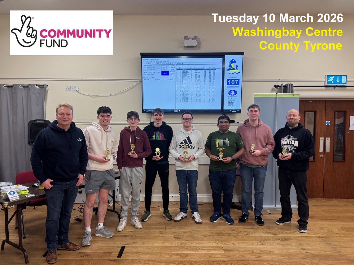 8pm to 10:30pm. 12 chess players from Bangor Chess Club attended this cross-community event at the Washingbay Chess Club in County Tyrone. Ranging in age from 9 upwards, it was a mix of children, adolescents, students, adults and pensioners. 32 players took part and the night was a great buzz. We distributed 10 trophies. The Under 19 Gold Cup was won by Oliver Mead from Whitehill in Bangor. The Under 16 Cup was won by Aharshi Banerjee (from India) who joined Bangor Chess Club last season and is one of the most talented 14 year olds in Northern Ireland. The Under 14 Cup was won by 9 year old Alex McKeown, an exceptionally gifted young player who travels from Belfast to all our events.