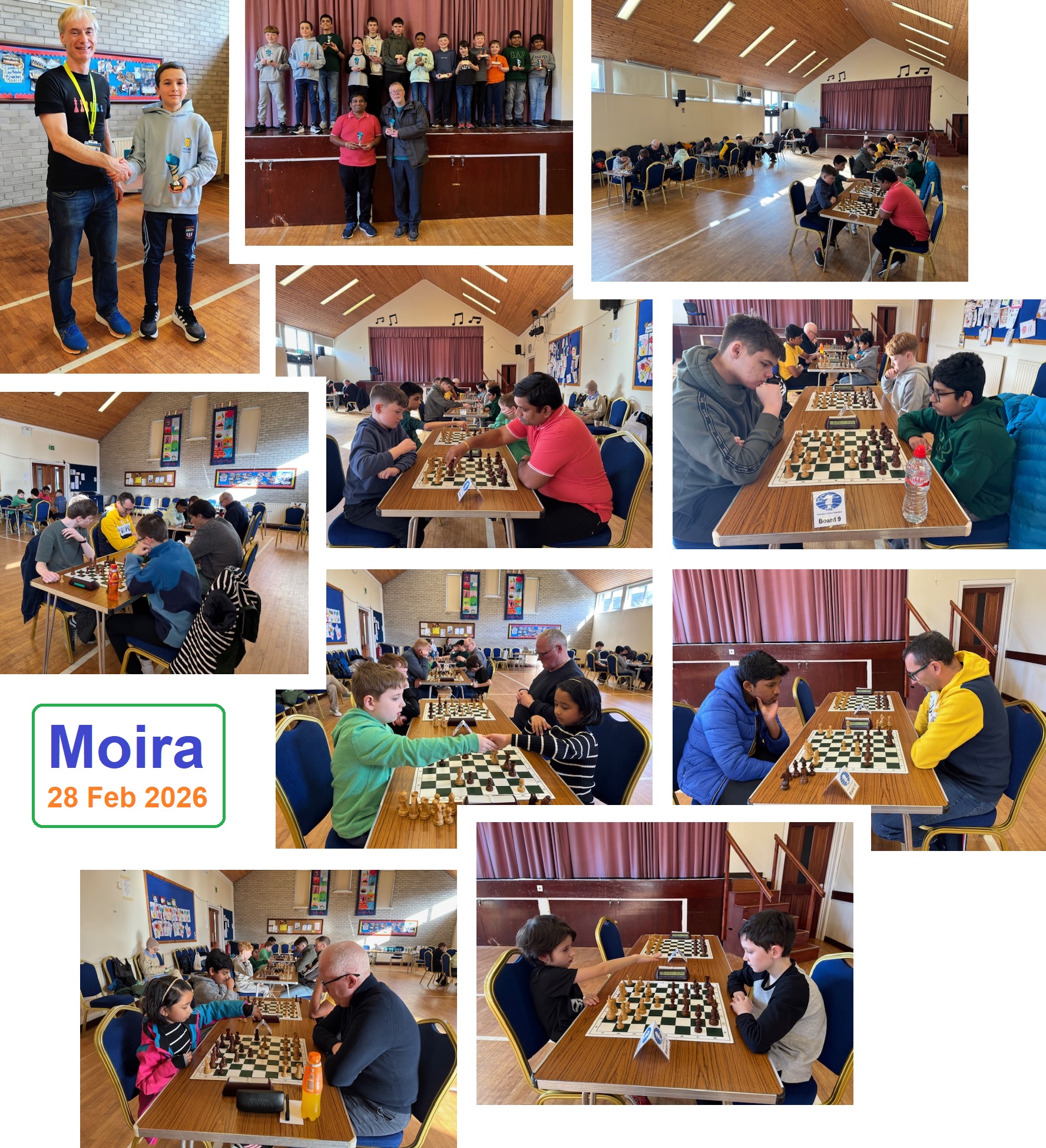 On Sat 28 February at Moira Presbyterian Hall, Bangor Chess Club held a very special event with 26 players from across Northern Ireland and the Republic of Ireland. With 15 awards up for grabs, it was 10 rounds of blitz chess at a time control of 5+5. Players ranged in age from our youngest, 7 year old Sanvi Shambharkar, to adults in their 60s. Attendees travelled from Bangor, Donaghadee, Belfast, Crumlin, Craigavon, Longford and Dublin. They enjoyed playing alongside local Moira players.