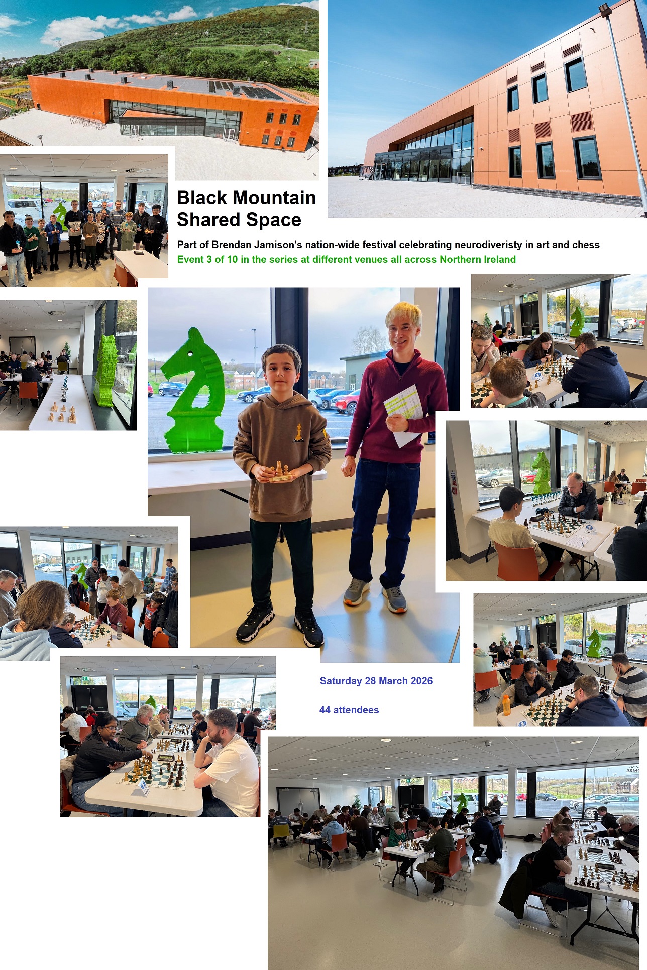 The next two events in the Neurodiversity Festival have been scheduled for Saturday 28 March 2026 at the Black Mountain Shared Space in West Belfast (a one day FIDE rapid, running from 10:30am to 4:30pm) and at the Golden Thread Gallery on Queen Street in Belfast City Centre on Saturday 25 April 2026 (a one day FIDE blitz, with a morning art workshop before the tournament, for children to learn how to make their own little ‘rising stars’ chess trophies).