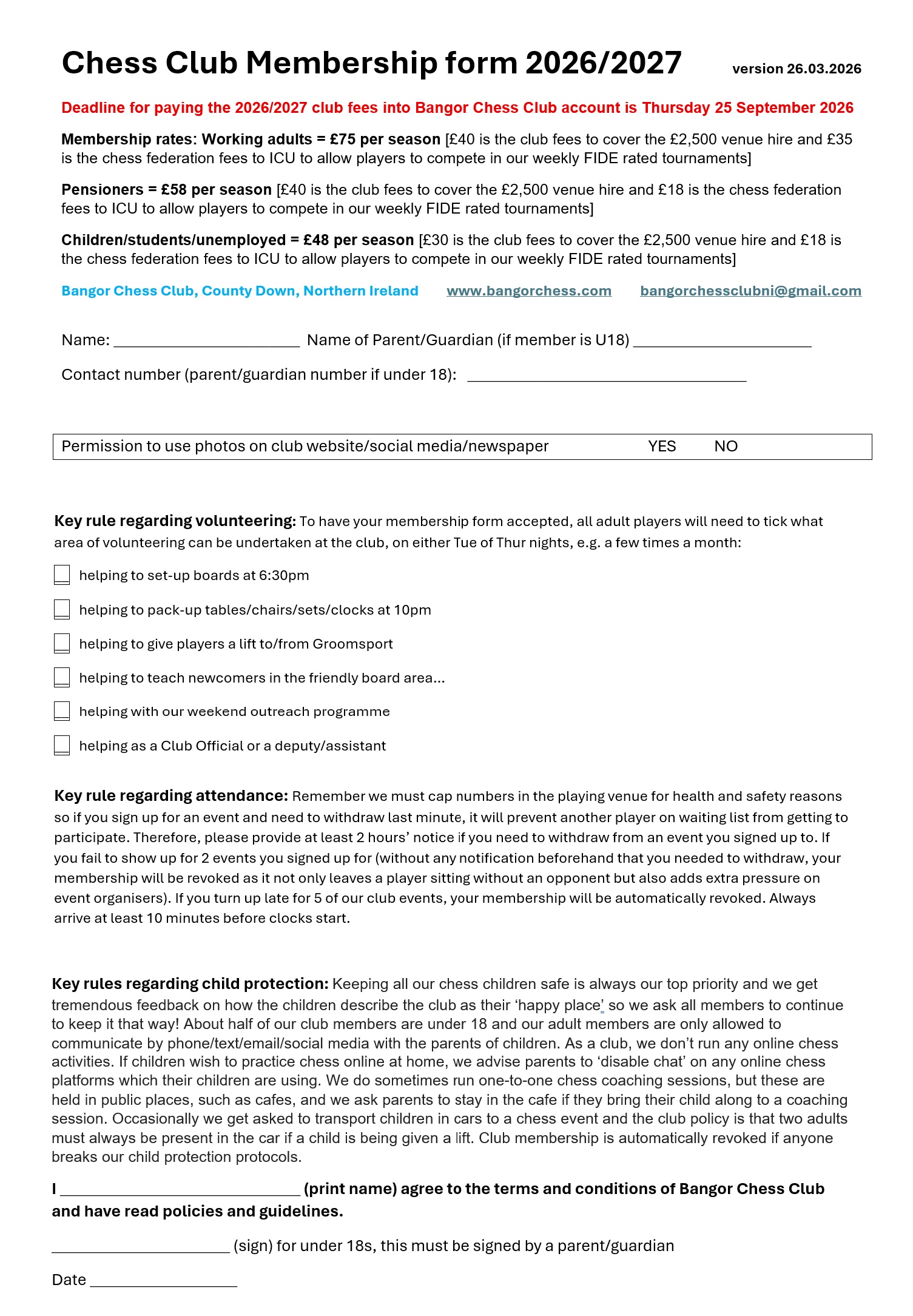 Please note, if you are playing in FIDE rated tournaments (which occur almost every week at the club), we will need to collect your Irish Chess Union (ICU) fees so your games can get rated (as all FIDE tournaments in Northern Ireland are done through the ICU). It costs 35 for year for adults, reduced to 20 per year for Under 18s, full-time students, unemployed and over 65s.