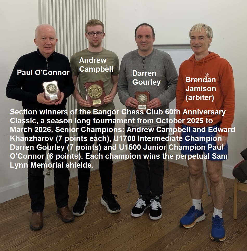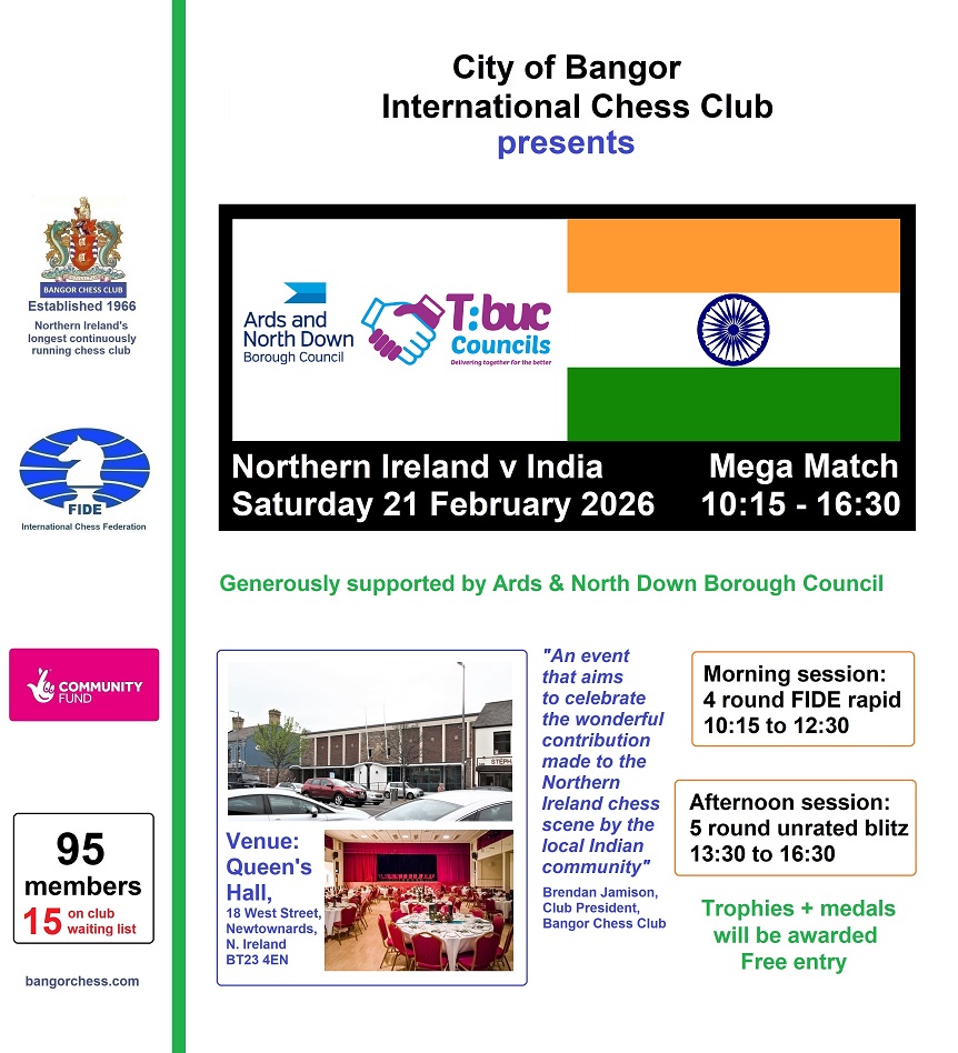 “the 2025/2026 season is particularly special as we celebrate our 60th anniversary in early 2026, making us the longest continuously running chess club in Northern Ireland. Over the past few years, the club has grown from 20 members to over 80, making it the largest in Northern Ireland and one of biggest in the UK! About half the members are primary school children and teenagers, from age 8 upwards. The cross-generational magic allows our younger players to learn every week from the adults and pensioners who bring a wealth of experience and wisdom to the game. Newcomers are very welcome to attend, sample the club, and if they enjoy the special atmosphere, we’ll invite them to join as members the following week when they return. We run the club as volunteers and try to keep chess very affordable so the fees are £40 per season for adults or £30 for U18s/students/unemployed which equates to about £1 per night for 3 hours of fun!”