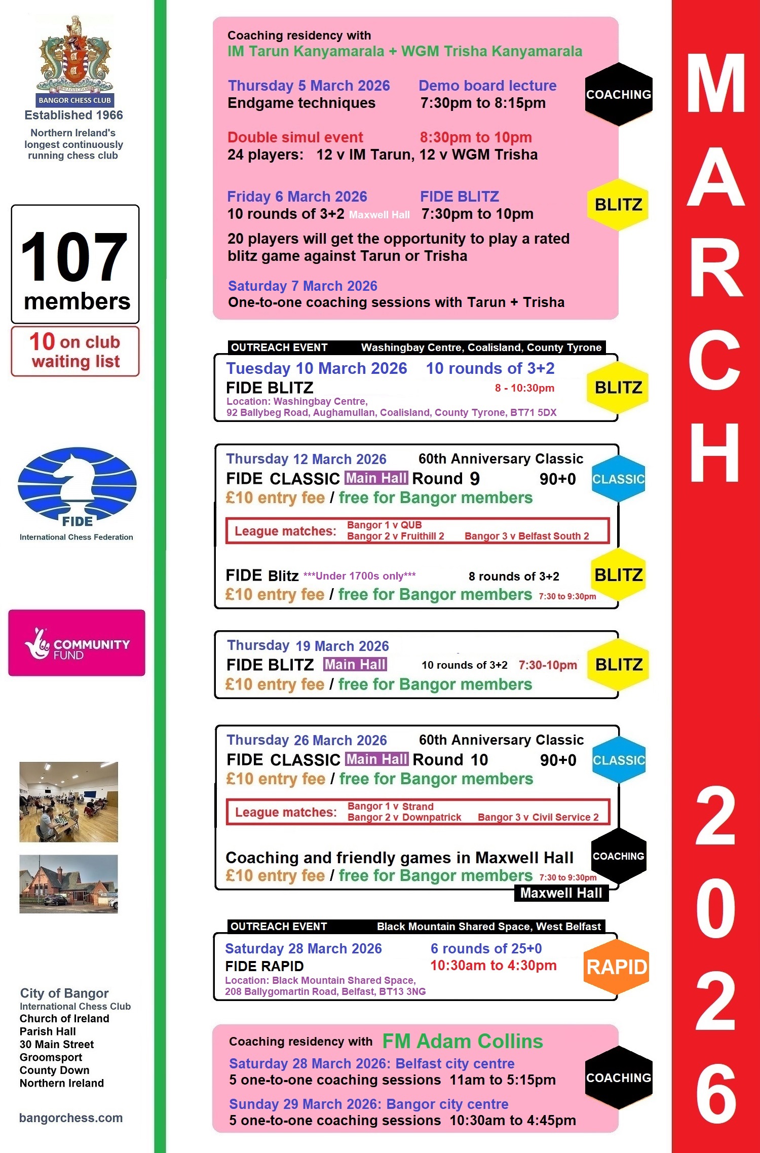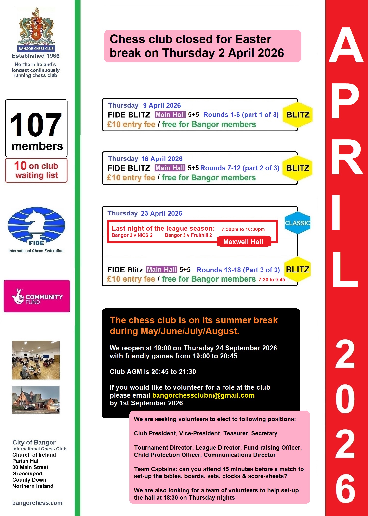 FIDE rated City of Bangor 60th Anniversary Classic – season long tournament [Round 1] from 7:30pm to 10:30pm.