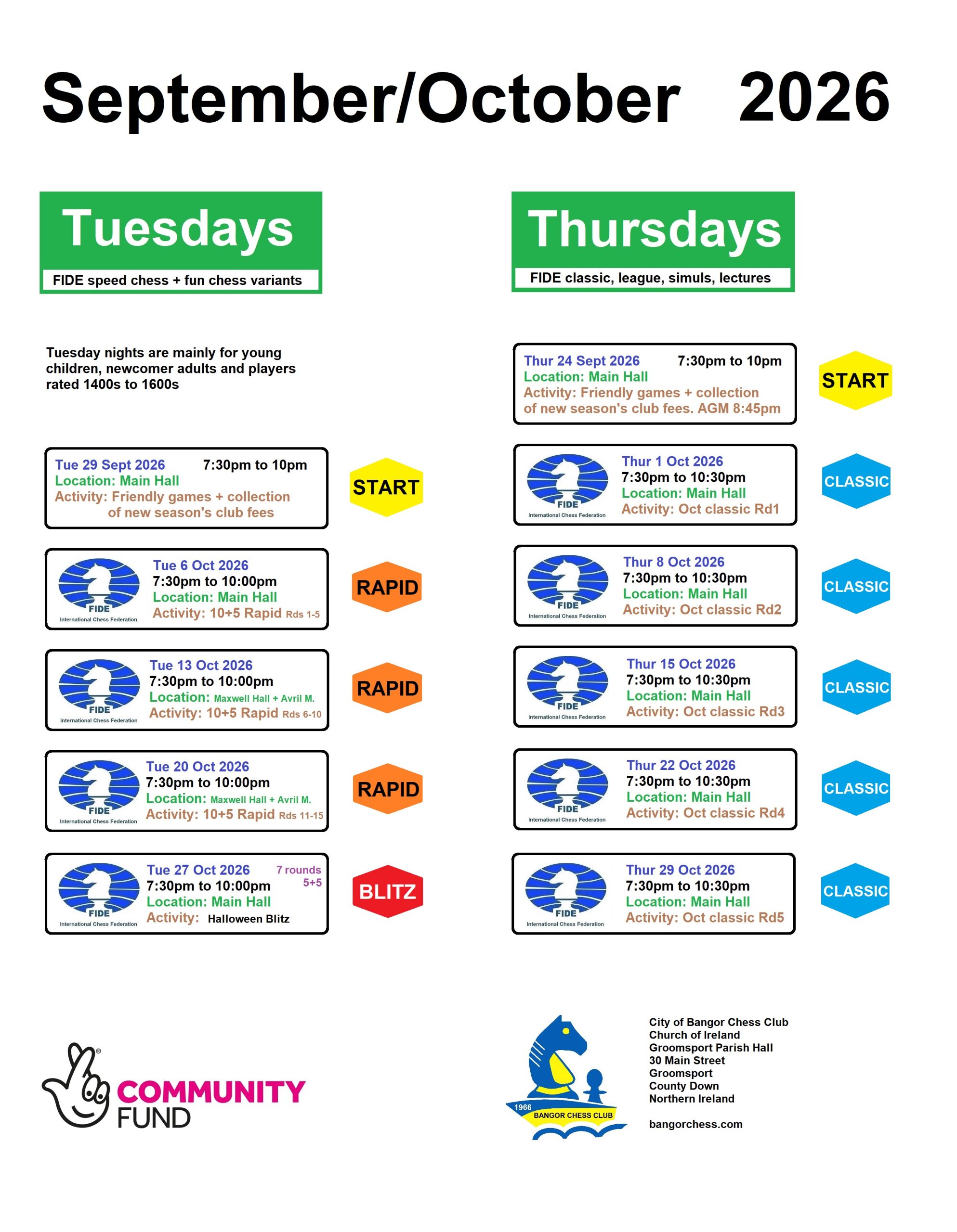 FIDE rated U1700 Groomsport Autumn Blitz 2025 from 7:30pm to 9:45pm.